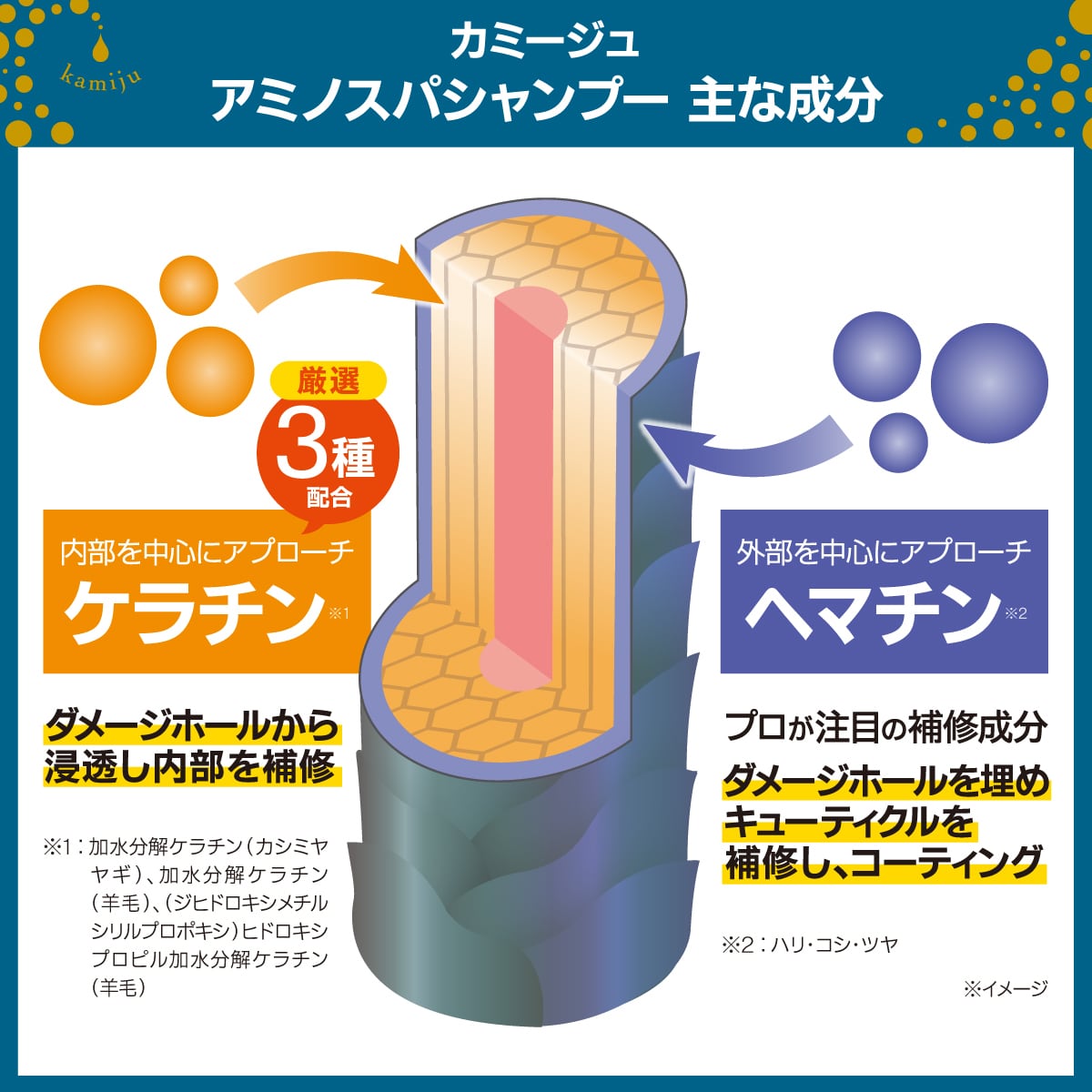 ①補修(ハリ・コシ):ヘマチン、3種類のケラチン※1、ヒートマルチコート※2